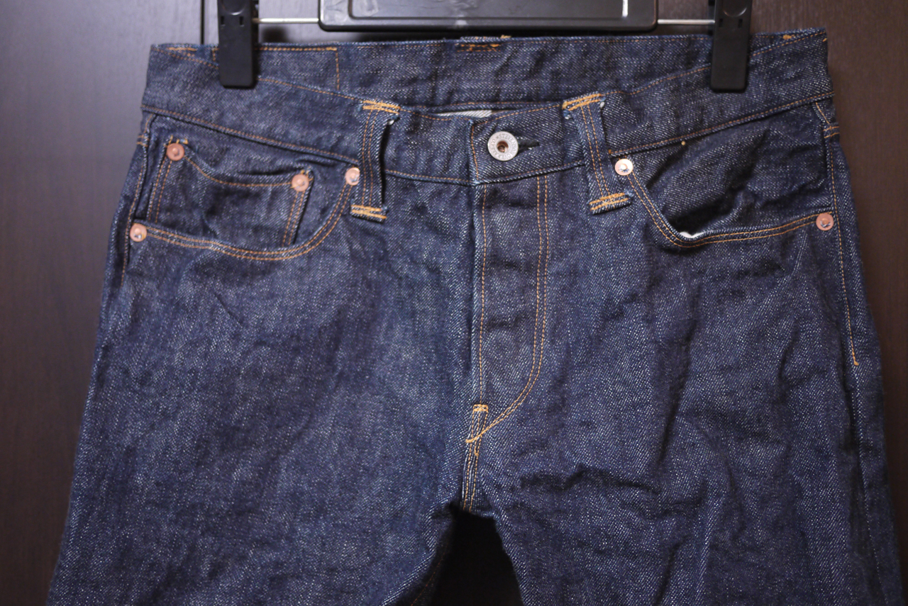 あとまあ、知っている人には当たり前の話ですが、リジットのデニムは洗うと滅茶苦茶縮むので、リジットの時点でジャストサイズだと、まず履くのは厳しいです。また、リジットの時点で履いても表記サイズよりゆるゆるなので、試着はきつくないかどうか、という観点でしてみると良いと思います。